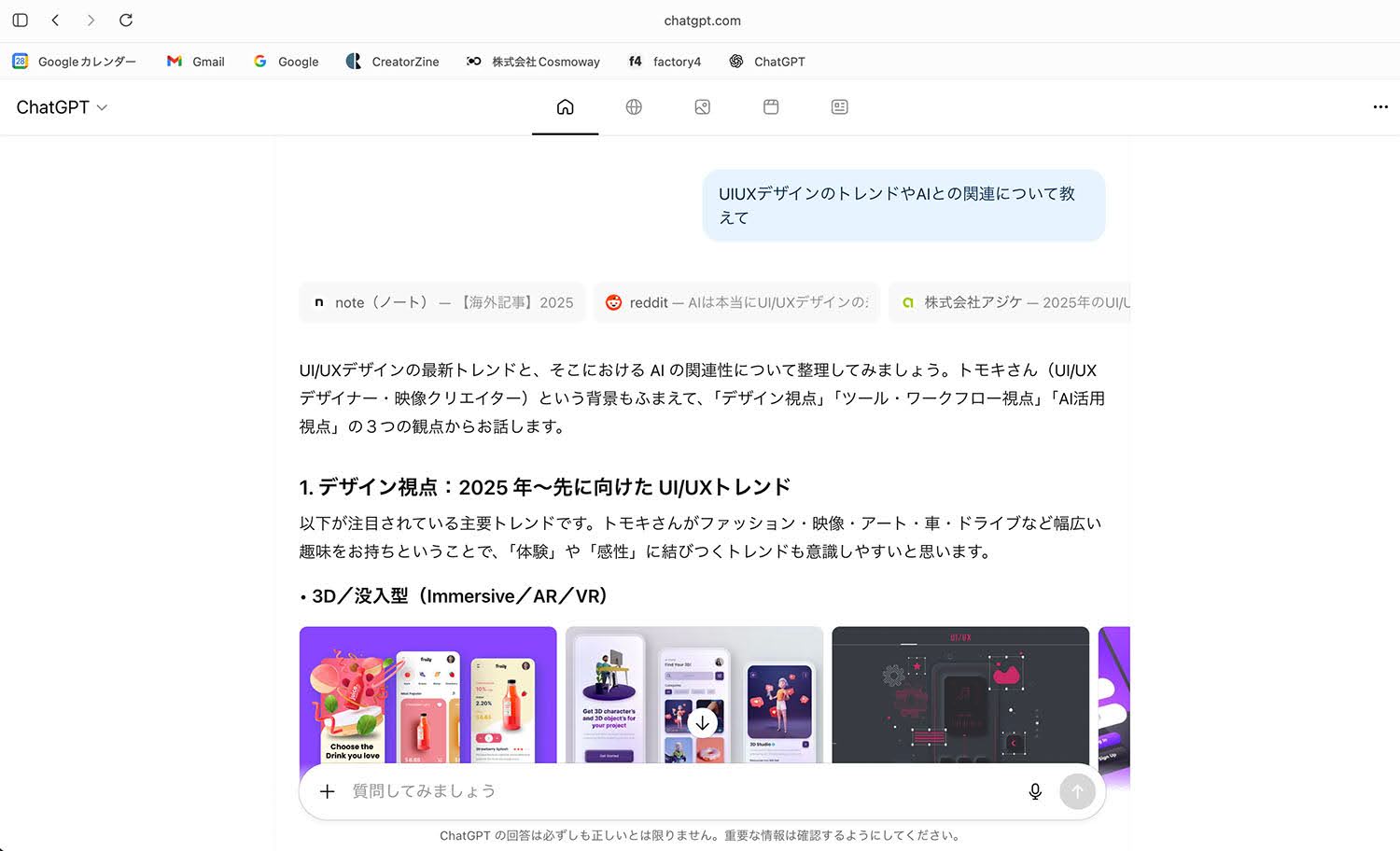 従来の検索は「自分で調べ、自分で選び、自分で読む」という3段階のプロセスがありました。Atlasはそれを一気に短縮します。「日本で注目されているAI、UXデザインの事例を教えて」と言うだけで、複数のニュース、カンファレンス資料、論文を横断し、要約と比較を生成。出典も明示され、「AIが拾ってきた情報の可視性」も確保されています。